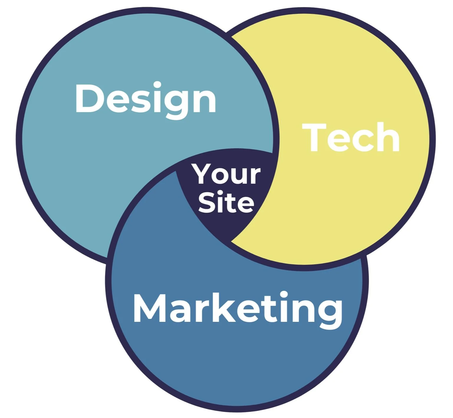 A great website requires careful attention to three critical elements: Design, Tech, and Marketing.